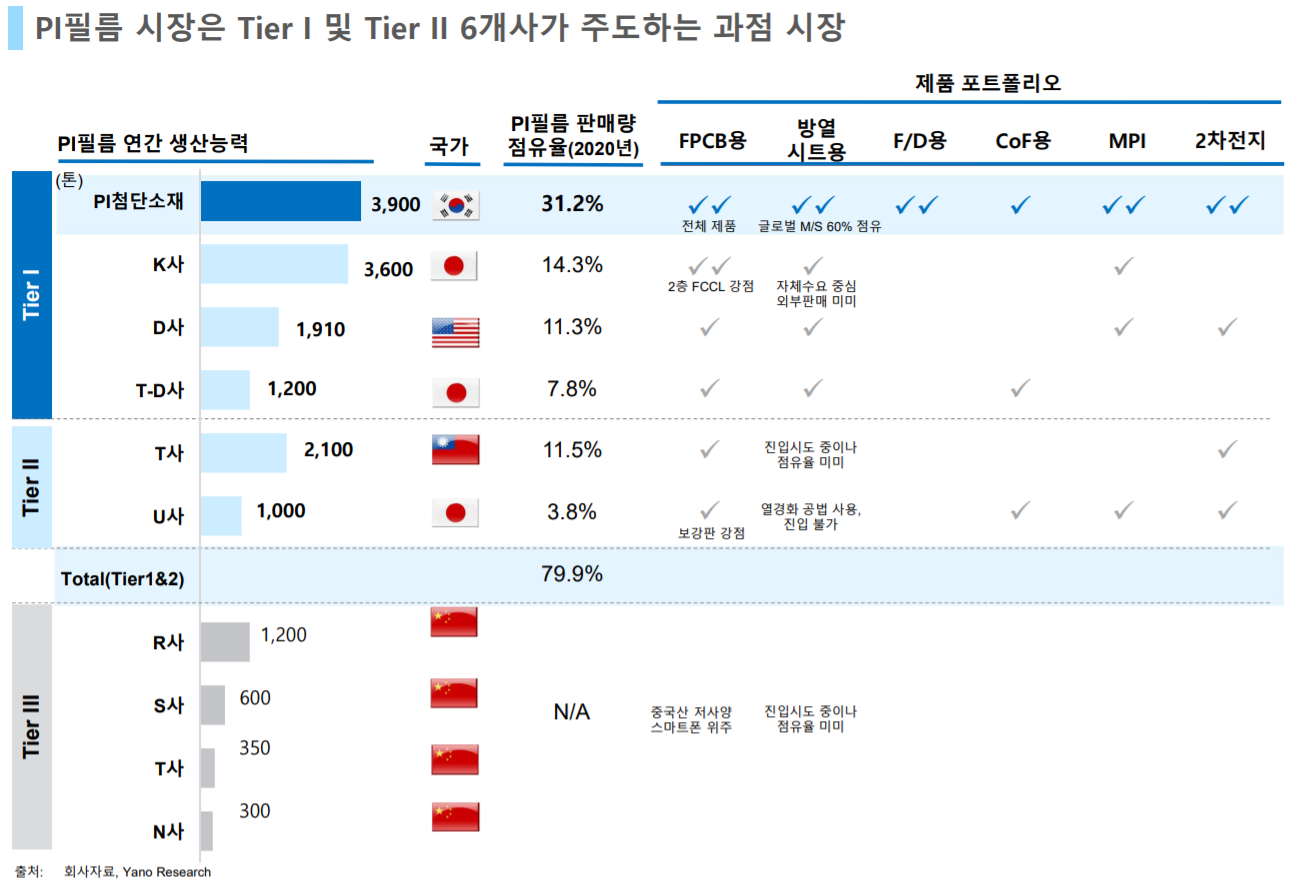 조금 기간이 지난 자료여서, 최신성이 떨어지기는 하나 전체적인 경쟁 구도를 파악하는 데는 문제가 없을 것이다. 또한 PI첨단소재 外 해외 업체의 경우 자료가 많지 않아 아래 자료가 도움이 될 것이다.